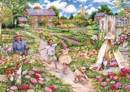 Deze puzzel van 500 stukjes legt perfect de vreugde van de kindertijd vast. Met de tuin in volle bloei en de moestuin vol, zijn de zomervakanties eindelijk begonnen en kunnen de kinderen de hele dag spelen.
