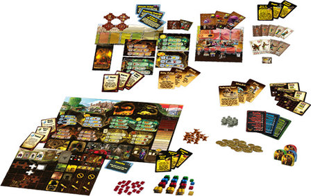 Dungeon Lords: Happy Anniversary bevat het basisspel Dungeon Lords , de uitbreiding Festival Season, stickers voor voedseltokens, metalen munten, een nieuwe mini-uitbreiding "Dungeon...