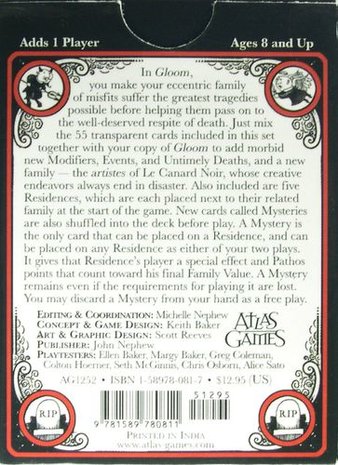 In het duister kaartspel Gloom neem je de controle over het lot van een excentrieke familie van mislukkelingen. Het doel van het spel is triest, maar eenvoudig: laat jouw personages de grootst mogelijke tragedies lijden voordat ze toe zijn aan de welverdiende rust van de dood...