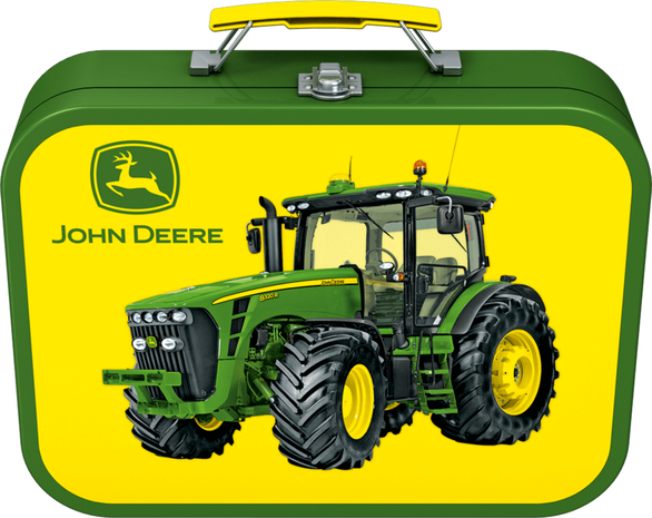 Puzzelbox voor jonge kinderen verpakt in een handige metalen koffer met een mooie opdruk van een John Deere tractor.