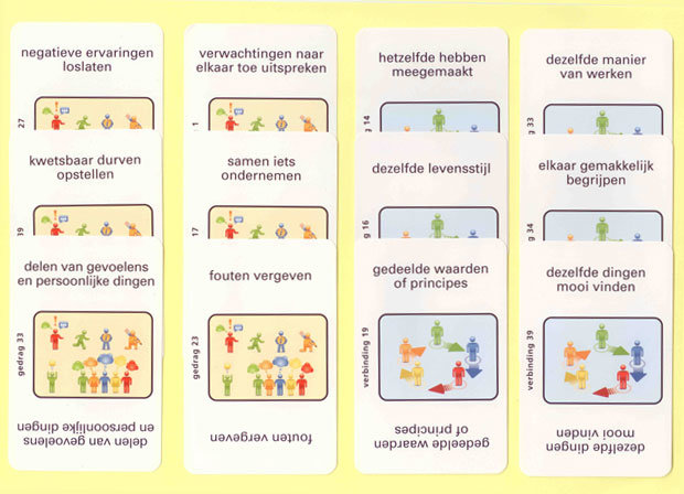 2. Verbindingskaarten - De vraag die hierbij centraal staat is: Wat verbindt ons met elkaar? Voorbeelden van verbindingen zijn: 'deel uitmaken van hetzelfde team','dezelfde manier van werken', 'elkaar goed aanvoelen' of 'gemeenschappelijke hobby's of interesses'.