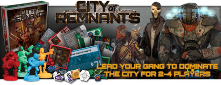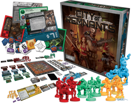 In City of Remnants, players take on the roles of gang leaders, each one with unique qualities and motivations. Players will struggle to control the city, but only the winner can decide the city's future. Many paths to victory lie before you. Bid for gang members who provide a variety of shady skills. Get an edge with weapons and other sundries from the black market. Build districts that can provide you with advantages, production and income, but beware because a greedy opponent might sweep in and take over the work of your own hands.