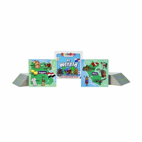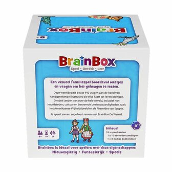 BrainBox is een leuk geheugen- en observatiekaartspel, met wereldwijd 8 miljoen verkochte exemplaren. Het spel test je oog voor detail. Alle antwoorden staan op de kaart, maar je hebt slechts 10 seconden om de kaart te bestuderen. In deze wereldeditie hebben spelers 55 met de hand geïllustreerde speelkaarten van landen uit de hele wereld met een wereldkaart, hoofdsteden, bezienswaardigheden en nationale iconen.