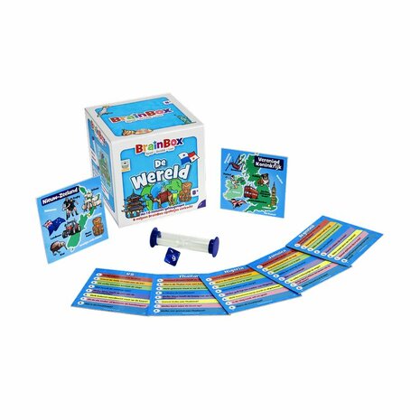 Brainbox: De Wereld bevat 55 speelkaarten, spelregels, 1 zandloper van 10 seconden, 1 8-zijdige dobbelsteen.