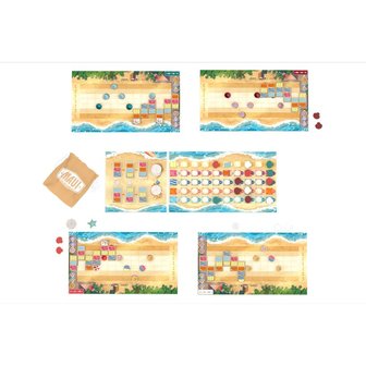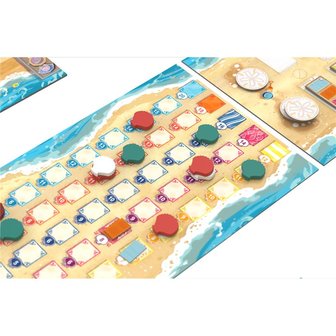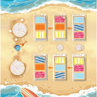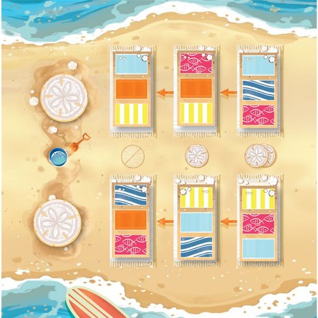 In the game, you have your own beach board with room for 13 towels, the board has seven rows in which towels can be placed, and during set-up, you randomly place eight umbrellas in designated locations on your board. Each player places one random towel in the left most column of their board; each towel has three different patterns on it. Place six random tiles in the two rows of the market and one sand dollar in each row.