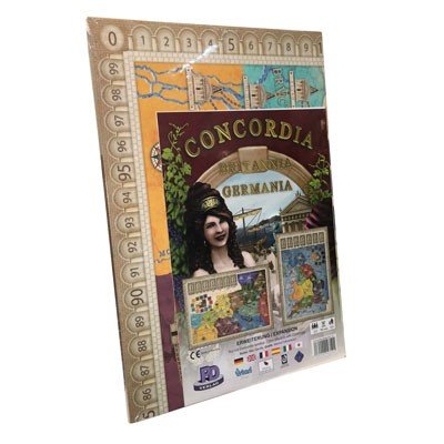 Concordia: Britannia / Germania features a double-sided map for Concordia. The Britannia map offers tight play with only 23 cities in ten provinces. Players start in London and Boulogne, expanding Britannia from the south. The Germania map features 30 cities in twelve provinces again. The additional castles, different starting positions, and sea colonists moving along rivers bring new options into play.