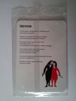 The promo stories feature art previously released in other Black Stories editions, but the text is new. Thematically, the five stories are about the SPIEL fair at Essen.