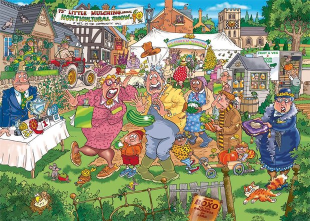 Dans le désopilant puzzle Original 32 de 1 000 pièces La grande pesée !, tout le village se prépare pour le grand concours de légumes. L’image sur la boîte montre les préparatifs de l’après-midi. Quand soudain, un événement stupéfiant attire l’attention des participants et les laisse bouche bée ! Que peut-il bien se passer pour que chacun ait une telle réaction de stupeur ? Mettez-vous à la place de la juge qui a fait tomber son bloc-notes et reconstituez la scène qu’elle est en train de voir.
