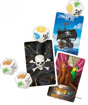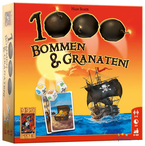 Jeu de dés avec thème pirate. Dans 1000 bombes et grenades! essayez de couper autant de symboles égaux que possible avec 8 dés. Vous pouvez lancer les dés autant de fois que vous le souhaitez, mais vous devez mettre de côté les crânes. Si vous lancez un troisième crâne, votre tour est terminé immédiatement et vous ne marquez pas de points. Une carte pirate indique vos options et limitations à votre tour. Plus vous obtenez de symboles égaux, plus vous marquez de points. Vous recevrez également des points supplémentaires pour l'or et les diamants. Si vous marquez tous vos dés, vous obtenez un bonus supplémentaire. Si vous lancez 4 crânes ou plus avec votre premier lancer, vous donnerez aux autres joueurs des points négatifs. Celui qui atteint un certain nombre de points en premier gagne la partie. 1000 bombes et grenades! est un jeu de dés simple, dans lequel vous devez toujours choisir entre arrêter ou continuer. Un jeu pour le vrai passionné de jeux d'argent!