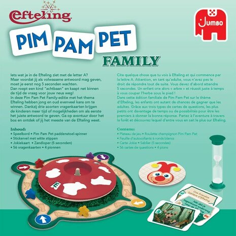 Pim Pam Pet Family - Efteling est un jeu de société familial édité par Jumbo qui combine le classique Pim Pam Pet avec la magie enchanteresse de l'Efteling. Ce jeu interactif et éducatif est parfait pour les familles et invite les joueurs à explorer l'univers féérique du parc, avec des défis qui font appel à vos connaissances, à votre rapidité et à votre créativité.