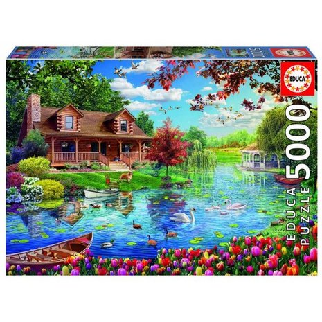 Un puzzle de pas moins de 5000 pièces représentant une belle maison au bord du lac. Le puzzle mesure 157 x 107 cm.