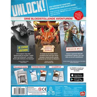 Unlock is een coöperatief kaartspel geïnspireerd door escape rooms; ruimtes waaruit je moet ontsnappen binnen 60 minuten. Unlock! laat je deze ervaring nu thuis aan je eigen tafel beleven met 3 scenario's (60 kaarten per scenario) en een gratis app die je door de 3 scenario's leidt. Doorzoek de ruimtes, combineer voorwerpen en los alle puzzels op voordat de tijd op is!