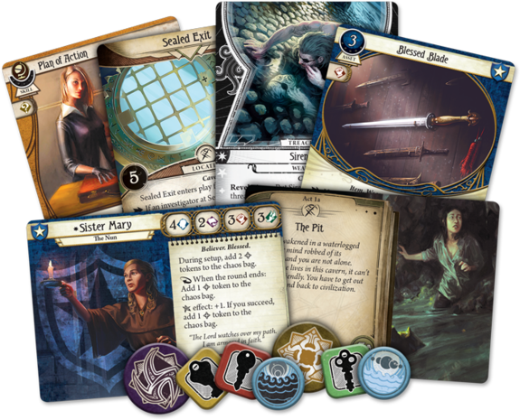 The Innsmouth Conspiracy, the sixth deluxe expansion for Arkham Horror: The Card Game, invites you to take your first steps in a twisting, time-jumping tale, starting with the campaign’s first two scenarios included in this expansion. From the heart of Innsmouth itself to the torturous coastline and beyond, these scenarios tee up an adventure that will continue to unfold across the subsequent six Mythos Packs. Far from including just two new scenarios, however, The Innsmouth Conspiracy brings five new investigators to the table with an undersea trove of player cards to support new types of decks—along with new mechanics for players to sink their teeth into, including keys, flood tokens, bless tokens, and curse tokens!