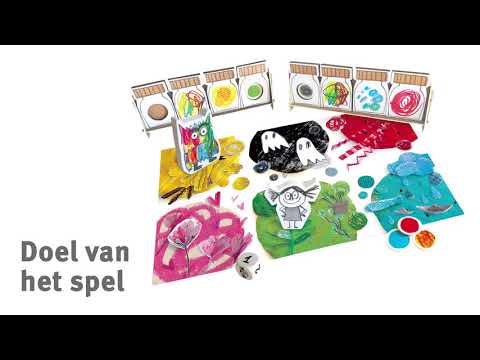 Inhoud van Kleurenmonster: 1 spelbord, 1 kleurenmonsterfiguur, 1 meisjesfiguur, 1 dobbelsteen, 8 potten (om emoties op te ruimen), 2 schappen (voor de potten), 5 emotietokens