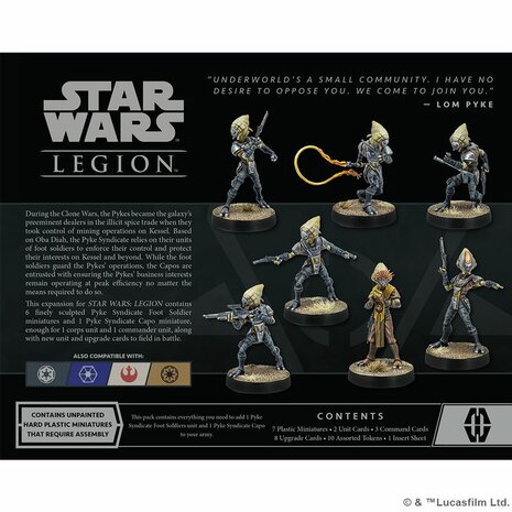 Players can hire additional soldiers to protect their interests throughout the galaxy with this pack for Star Wars: Legion! Adding a corps unit of six Pyke Syndicate Foot Soldiers that can join...