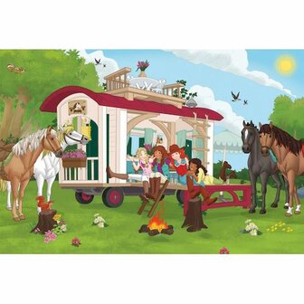 Paarden Club - Kampvuur bij de Caravan is een kinderlegpuzzel van 100 stukjes van Schmidt (artikelnummer 56463), ideaal voor jonge paardenliefhebbers vanaf 6 jaar. Deze betoverende puzzel toont een sfeervolle scène van een kampvuur bij een caravan, omringd door paarden en hun verzorgers, wat de verbeelding en passie voor paarden bij kinderen stimuleert.