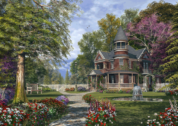 Puzzel met een romantische afbeelding van Dominic Davison, een Engelse kunstenaar. Dominic's liefde voor het platteland en de architectuur in zowel Engeland als Amerika resulteert in deze charmante afbeeldingen van huisjes, herenhuizen en koloniale herenhuizen.