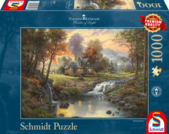 Een puzzel van Thomas Kinkade met een blokhut in de wildernis van Amerika met watervalletjes, herten, rokende schoorstenen en een berggebeid op de achtergrond.