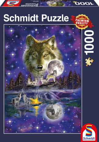Deze puzzel heeft een afbeelding van een sfeervol plaatje van een roedel wolven in het maanlicht bij een vuurtje aan het water. De puzzel maken is een echte uitdaging maar als hij af is heb je een echt wow effect.