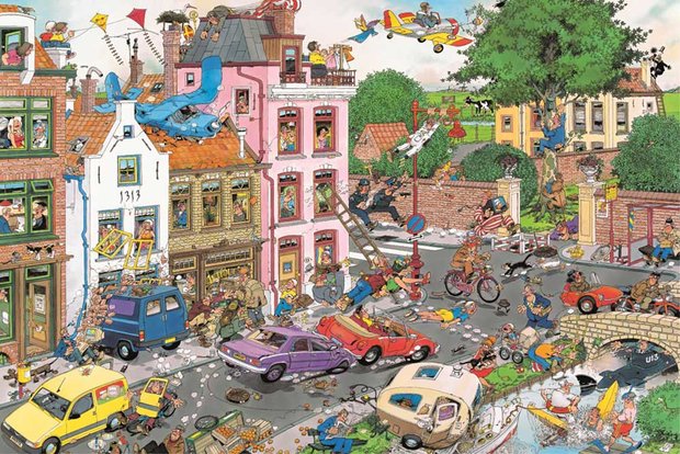 Wat een pechdag! Zet deze Jan van Haasteren puzzel van 1000 stukjes in elkaar en ontdek de haaienvin, Sinterklaas en natuurlijk Jan van Haasteren zelf!