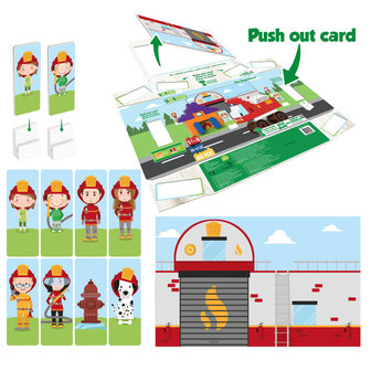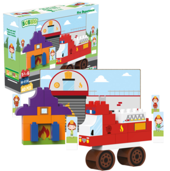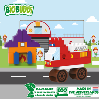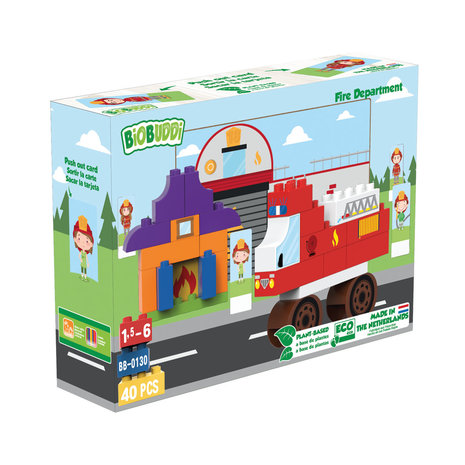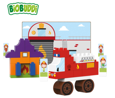 De speelset brandweer kazerne bestaat uit 40 verschillende onderdelen, gemaakt van resten uit de suikerriet plant. De blokken zijn milieuvriendelijk, recyclebaar, duurzaam en ook uitwisselbaar met andere merken. De verpakking is zo ontworpen dat het onderdeel uit maakt van het product. Het is gemaakt van FSC karton en met een simpele ‘push’ kan je gemakkelijk verschillende kaartjes eruit halen en zetten in de bijgevoegde kaarthouders voor nog meer speel plezier.
