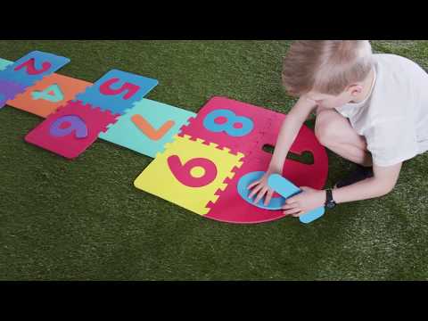 Een klassiek spel met kleurrijke en duurzame onderdelen van foam. Geschikt voor binnen en buiten. Gooi de schijfjes in een vak en hinkel er heen om ze op te pikken. De hinkelbaan bestaat uit losse onderdelen en de afmeting is ongeveer 62x216cm.