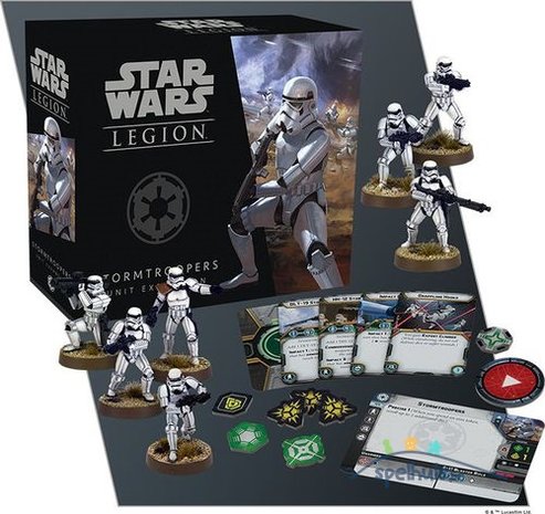 In the Star Wars: Legion – Stormtroopers Unit Expansion, you'll find seven Stormtrooper miniatures, identical to the ones included in the Star Wars: Legion Core Set, along with the unit card and upgrade cards that you need to add another unit of Stormtroopers to your army.
